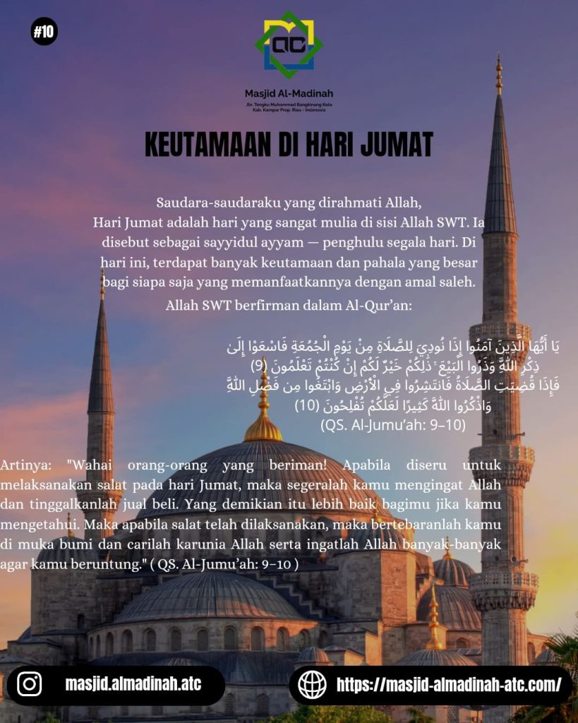 Semoga Allah jadikan kita termasuk orang yang memuliakan hari Jumat dan mendapat keberkahan di dalamnya. ( https://masjid-almadinah-atc.com/ Zeldi Firman )
