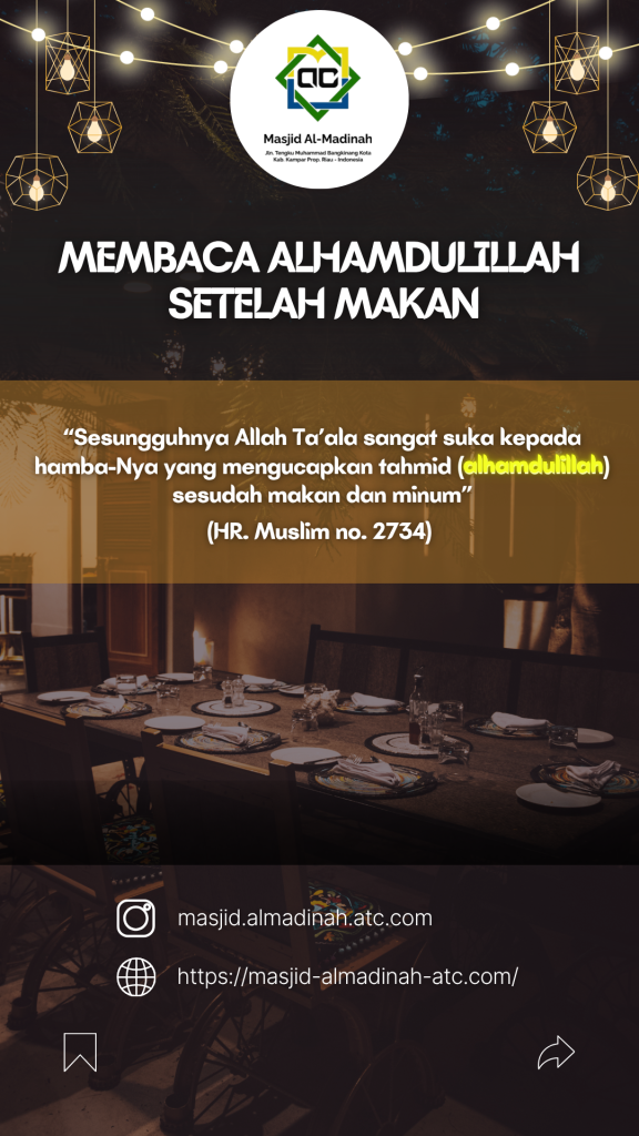 “Sesungguhnya Allah Ta’ala sangat suka kepada hamba-Nya yang mengucapkan tahmid (Alhamdulillah) sesudah makan dan minum.” (HR. Muslim no. 2734)